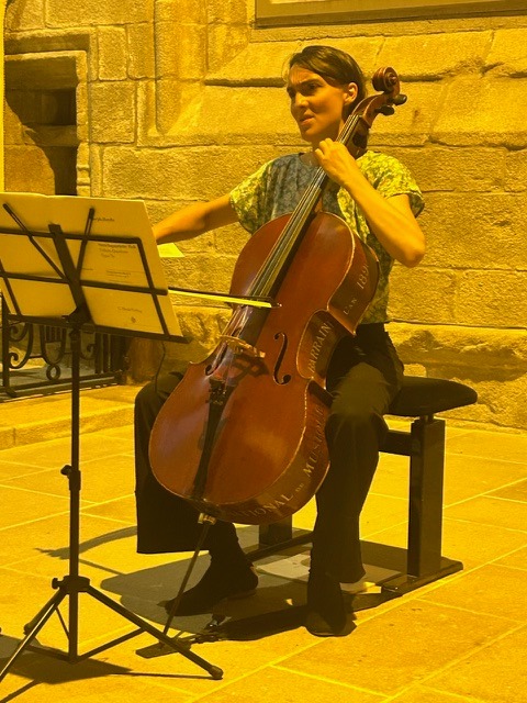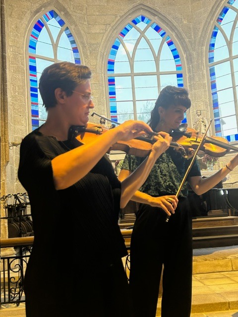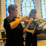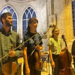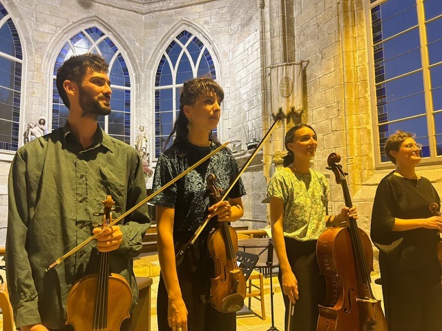 La musique en quatuor à cordes est une des plus exigeantes. Ecoute, réponse, échange des motifs entre les instruments : pari magnifiquement gagné hier soir, samedi, pour notre second concert. Deux œuvres classiques, le Trio op. 9 numéro 3 en do mineur de Beethoven et le Quatuor op. 76 numéro 4 de Haydn encadraient le contemporain Archipel II de Boucourechliev. Clotilde Lacroix au violoncelle, Robin Kirklar à l’alto, Constance Ronzatti et Marie Salvat au violon, de toute évidence heureux de jouer ensemble, ont non seulement manifesté leur grande virtuosité, mais nous ont aussi montré, avec rigueur et sensibilité tout ce qu’un instrument à cordes pouvait exprimer. La musique de Beethoven et Haydn projetée dans la nef, se lovait derrière chaque pilier pour finalement nous envelopper dans une conversation entremêlée, mais avec des respirations, et chaque instrument gardait sa voix indépendante.